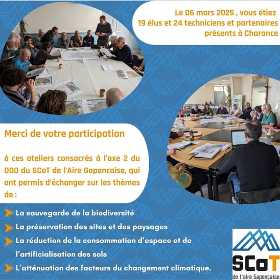 Tout au long du travail de révision du SCoT, le Syndicat Mixte de l’aire gapençaise a organisé des ateliers thématiques à l’occasion du diagnostic, du Projet d’aménagement Stratégique, ainsi que du Document d’Orientations et d’Objectifs (DOO).